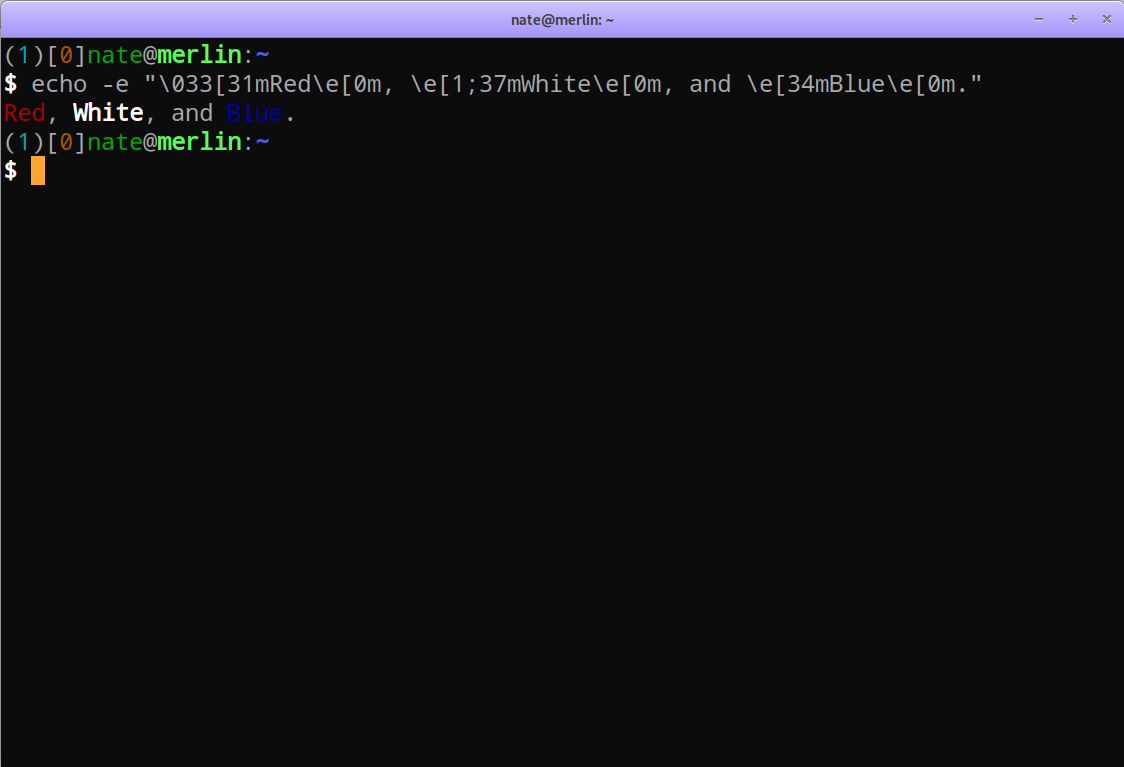 The first way of adding color to the shell prompt or to manual pages is often learned by way of ANSI escape sequences. Escape sequences are fun to play with and much can be learned about the basics of terminal behavior through their use. The following screenshot shows the sequences to print text in color: