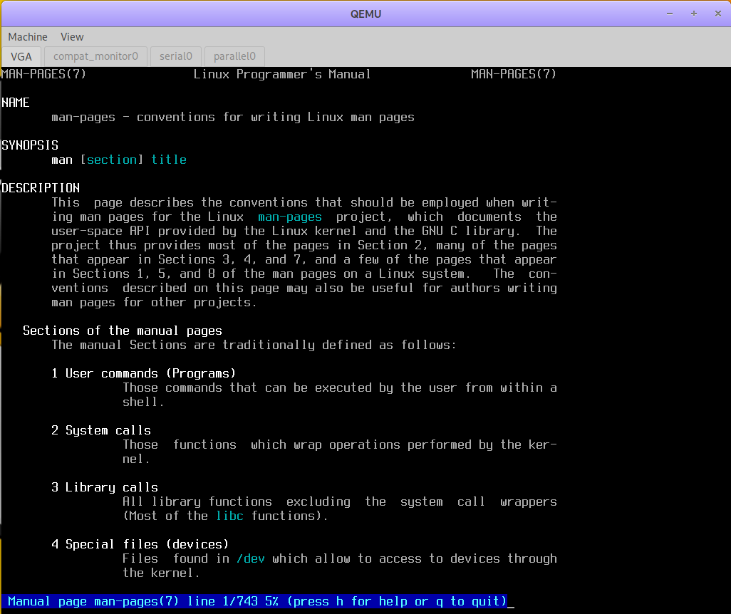 The following screenshots show the same manual page in an Xterm and on the Linux console: