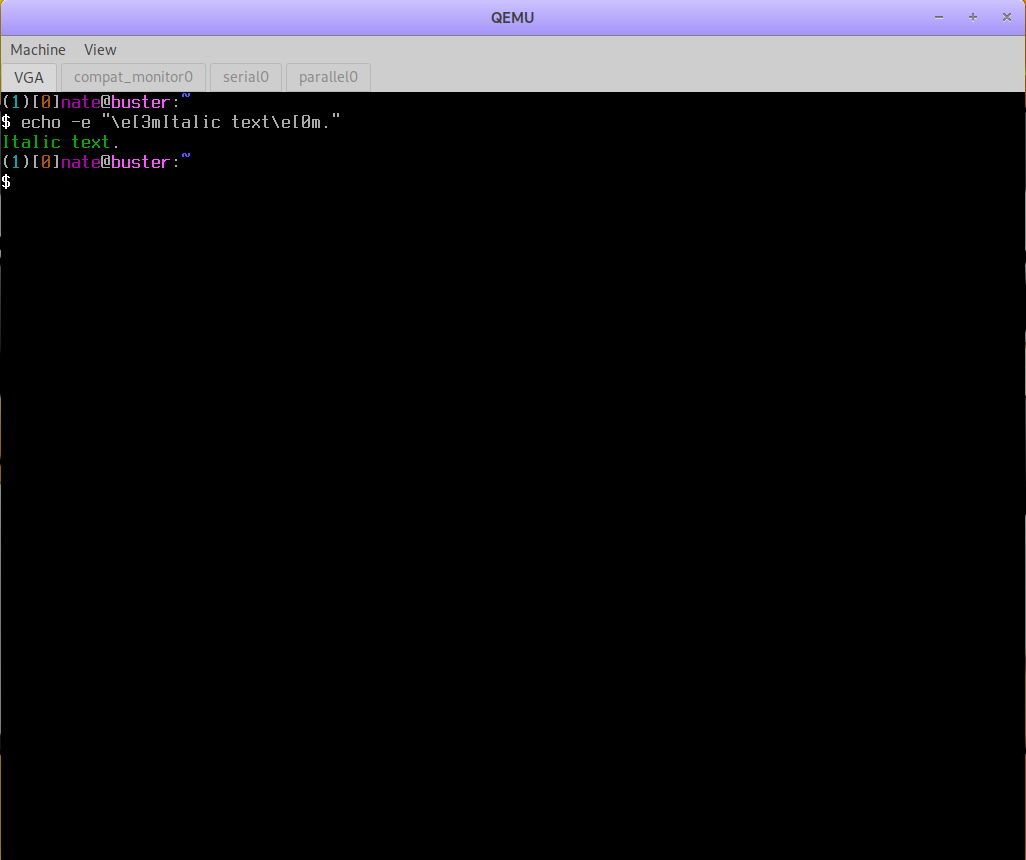 Here we see green text instead of the expected italics on the Linux console when a raw escape sequence is used: